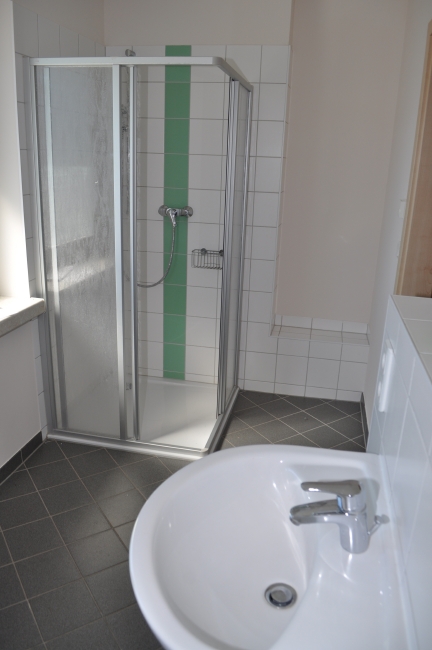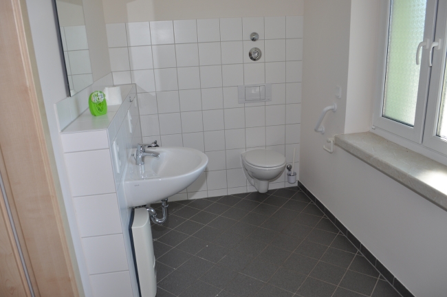 Bad: Behindertenfreundlich ausgestattet, mit WC, ebenerdiger Dusche, Fenster, voll gefliest, Waschmaschinenanschluss